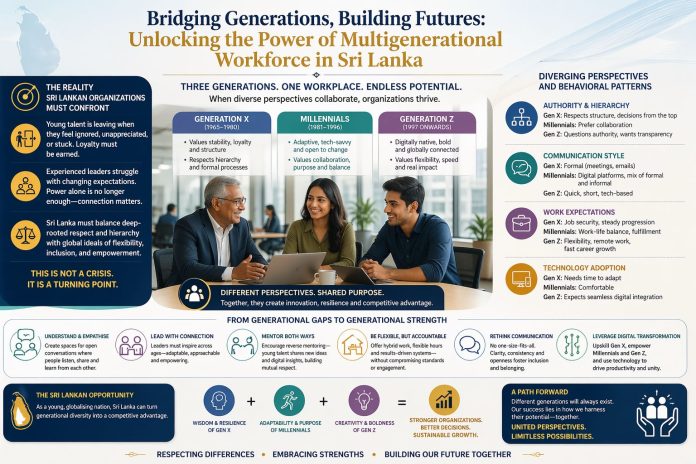 Walk into any modern Sri Lankan organisation today and you will witness something remarkable. At one table sits a seasoned professional who built a career through resilience and loyalty. Across from them, a dynamic mid-career expert balancing ambition with purpose. Nearby, a young employee—digitally fluent, bold, and impatient to make an impact. Presently, three distinct generations—Generation X, Millennials, and Generation Z—collaborate within these organisations. Each generation contributes unique values, expectations, and behaviours shaped by differing socio-economic backgrounds. This diversity presents considerable opportunities; yet, it also introduces challenges that many organisations find difficult to address.