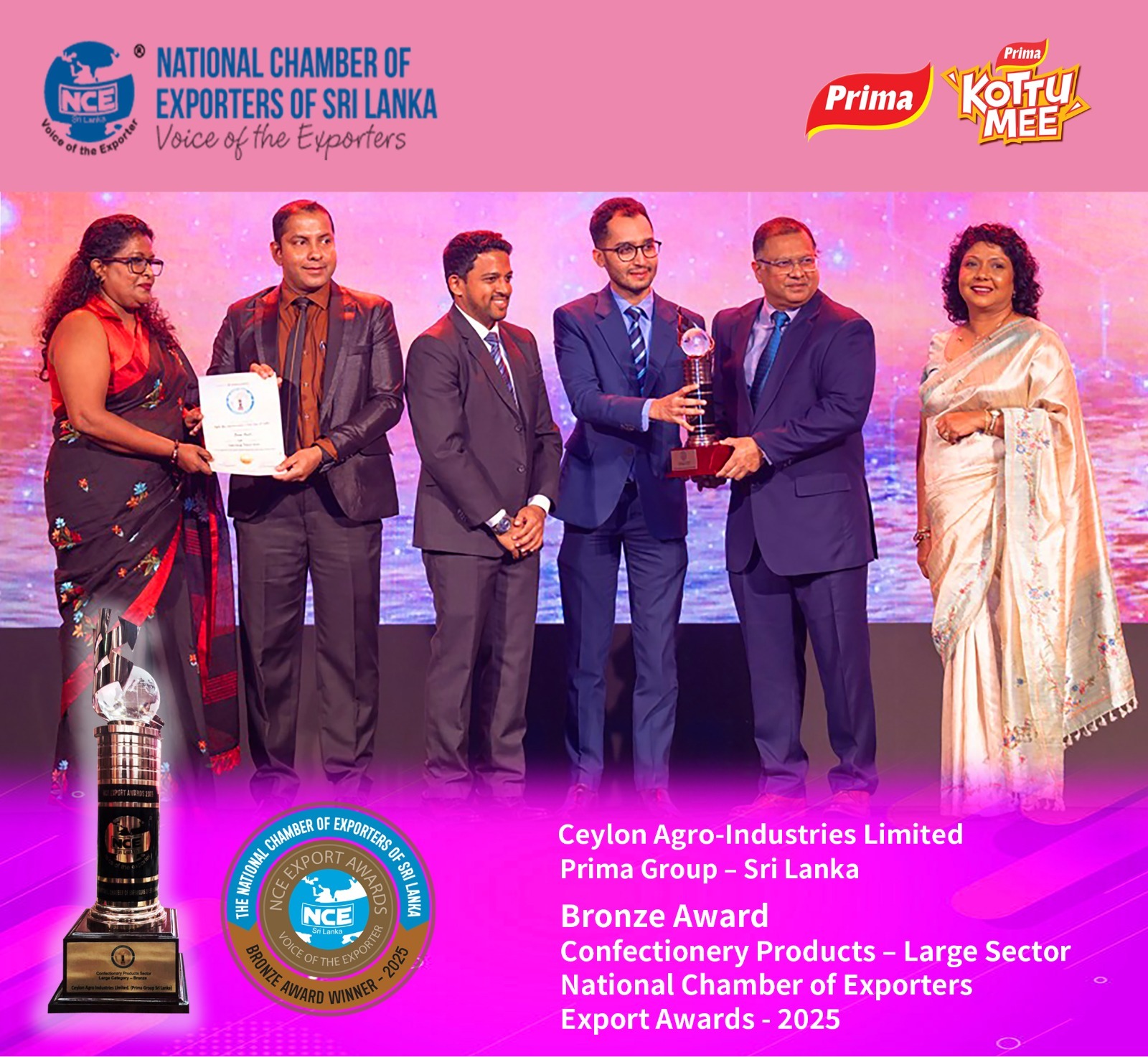 Ceylon Agro Industries, Prima Group Sri Lanka, has been honoured with the Bronze Award in the Confectionery Products – Large Sector category at the prestigious National Export Awards 2025, organised by the National Chamber of Exporters of Sri Lanka (NCE).